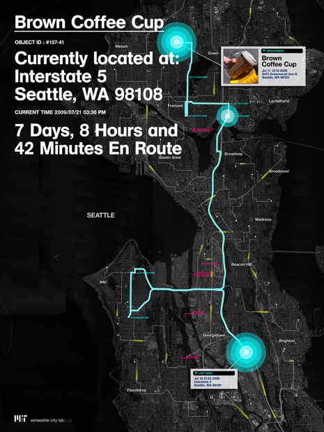 • "Trash Track" focuses on how pervasive technologies can expose the challenges of waste management and sustainability. The project uses hundreds of small, smart, location-aware tags, a first step towards the deployment of smart-dust -- networks of tiny, locatable and addressable micro-electromechanical systems. These tags are attached to different types of trash so that these items can be followed through the city's waste management system, revealing the final journey of our everyday objects in a series of real-time visualizations.